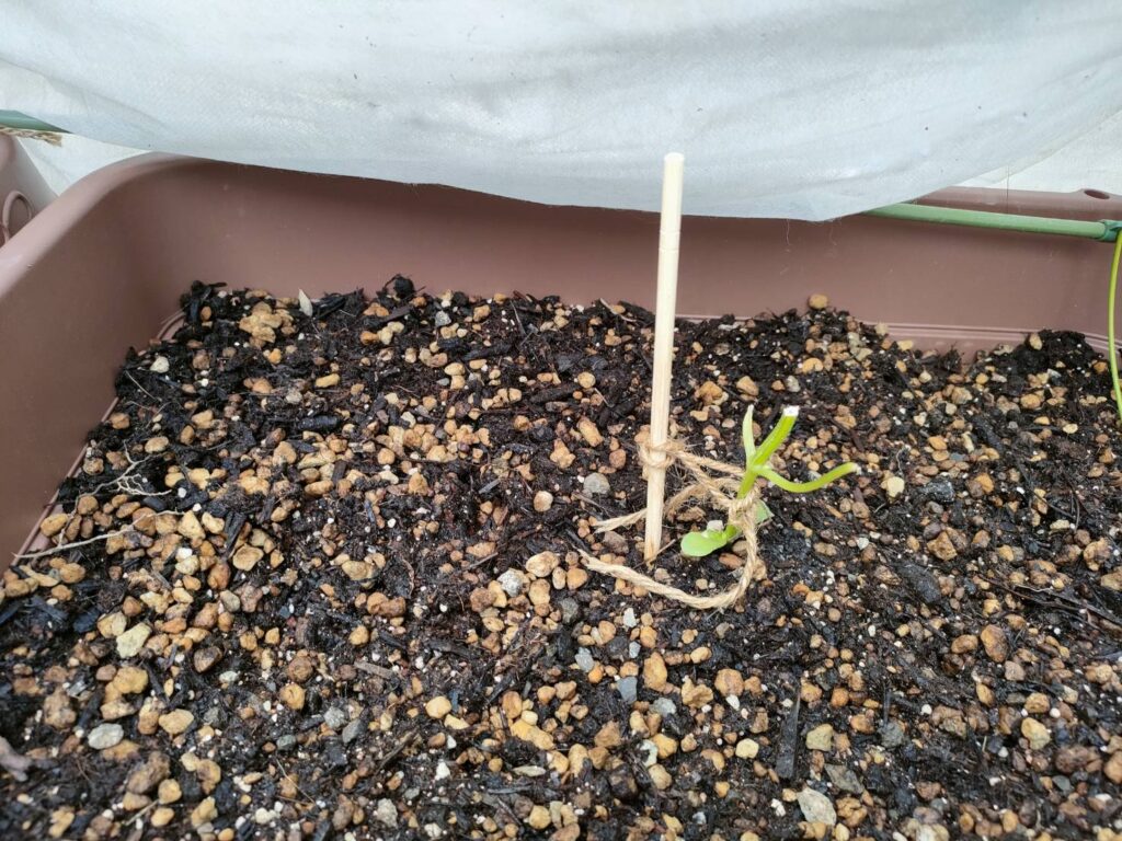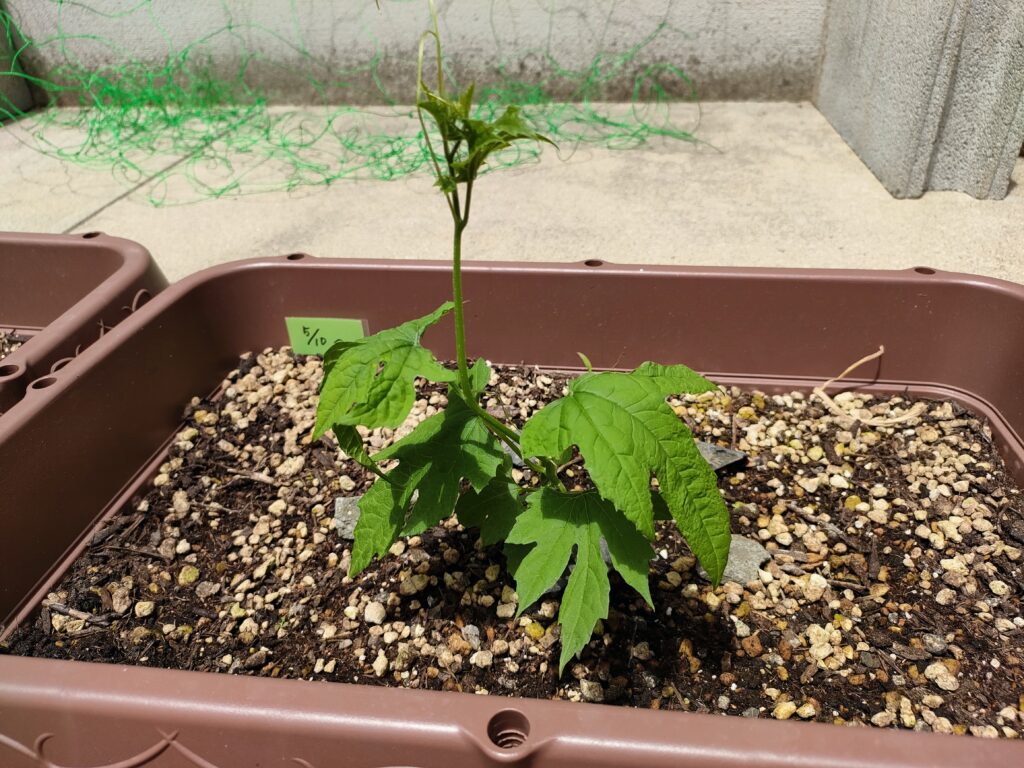 まだまだ小さなゴーヤ。大きくなるまでは温度管理に気を使いました。温室で栽培された苗が急に露地で栽培され強風にさらされたんですもん、そりゃだめにもなりますよね…。ちょっと荒っぽかったかなと反省しましたが、気を取り直して温度管理しながら再育苗しました。葉っぱはほぼ全滅でしたが、根っこが枯れていないと信じて頑張りました。