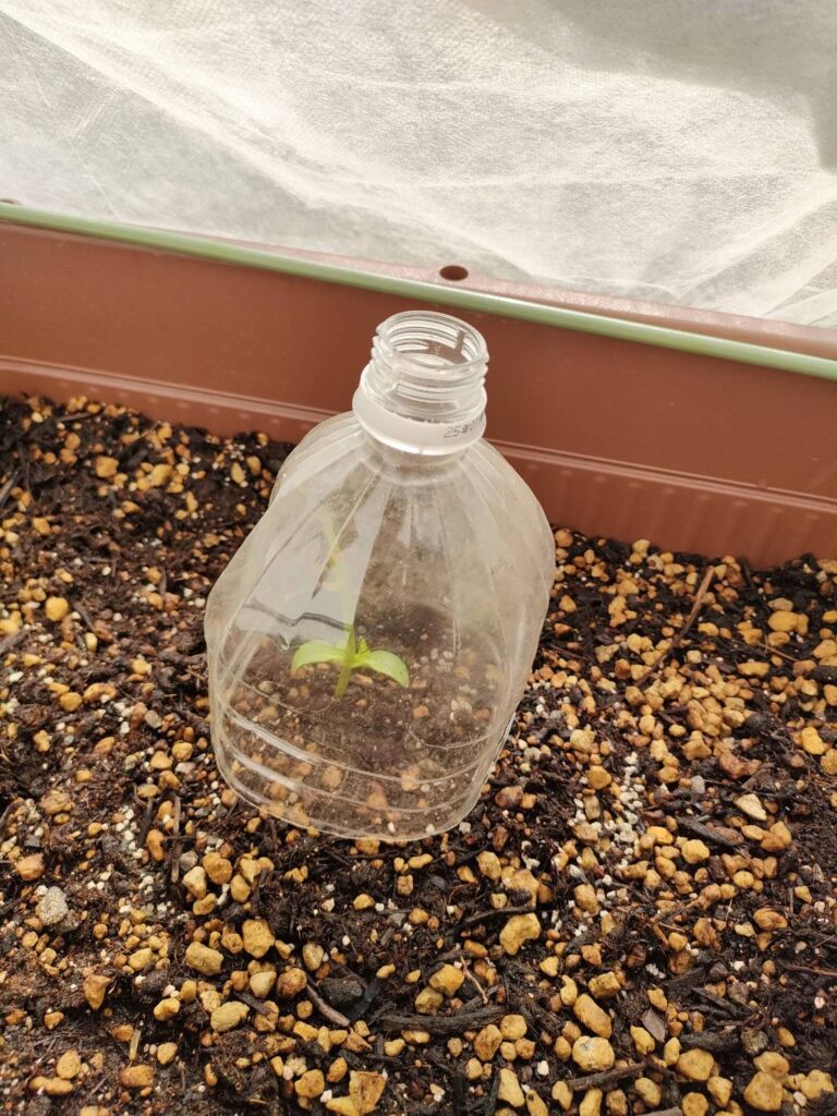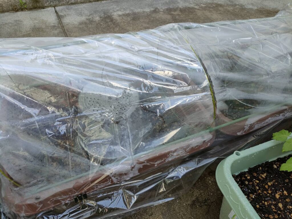 もう少し温度を上げると苗が成長するかと思いビニールで覆いました。